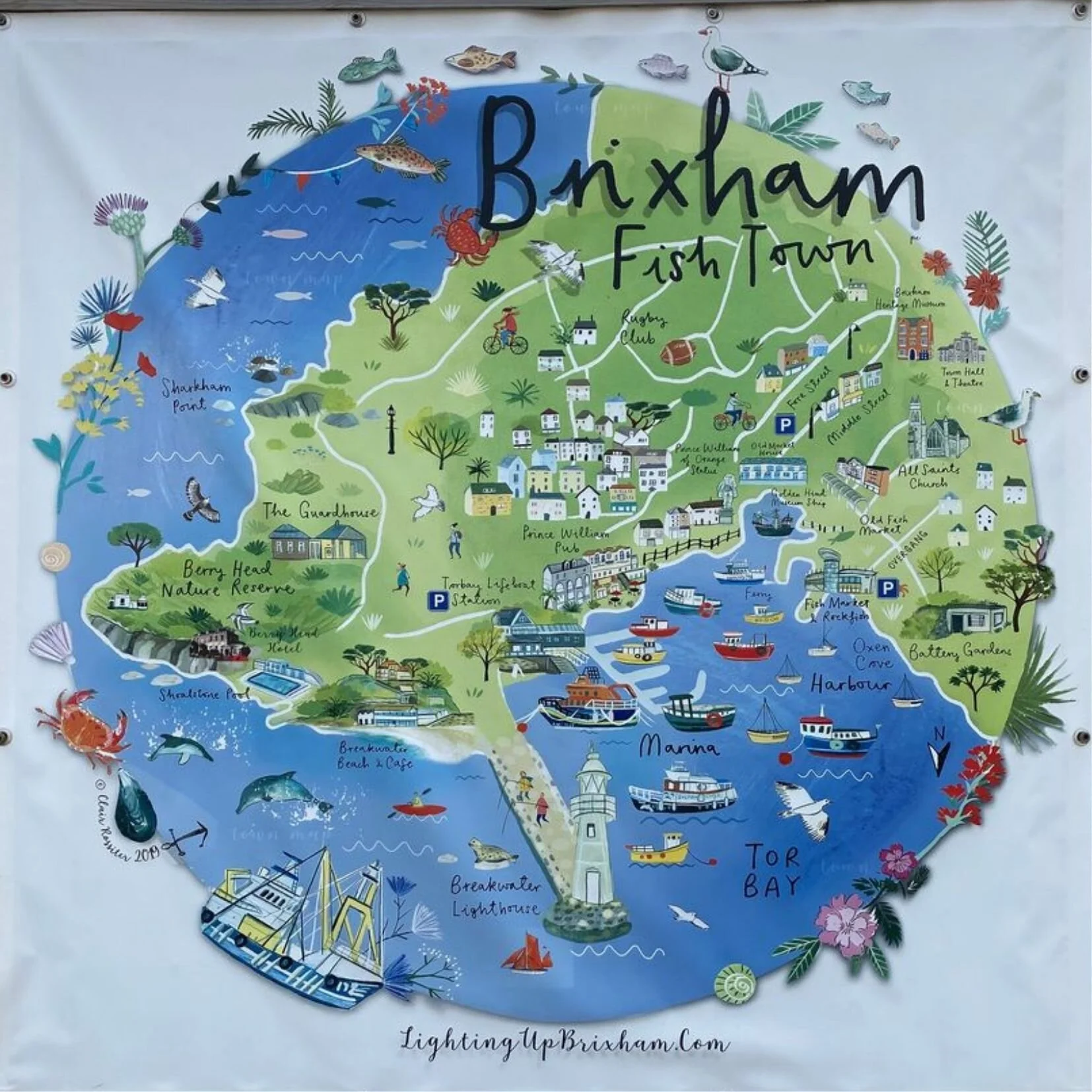 Having finished a, frankly incredible, breakfast sandwich from The Breakwater Cafe, you’ll begin your walk at the foot of the breakwater. Here, you’ll see a small sign with information detailing the history of the breakwater. A new addition for 2020, there is a wonderful map of Brixham, commissioned by Lighting Up Brixham and designed by illustrator Clair Rossiter.